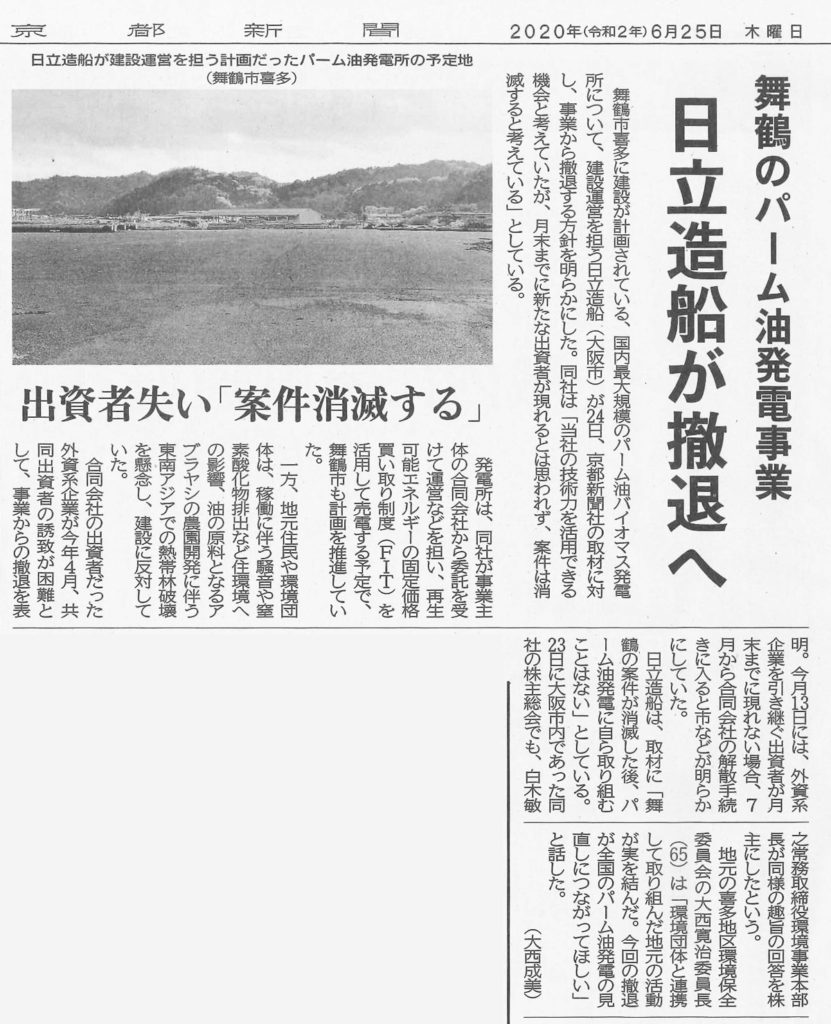 舞鶴と福知山のパーム油発電反対運動が朝日新聞に大きく取り上がられました。
