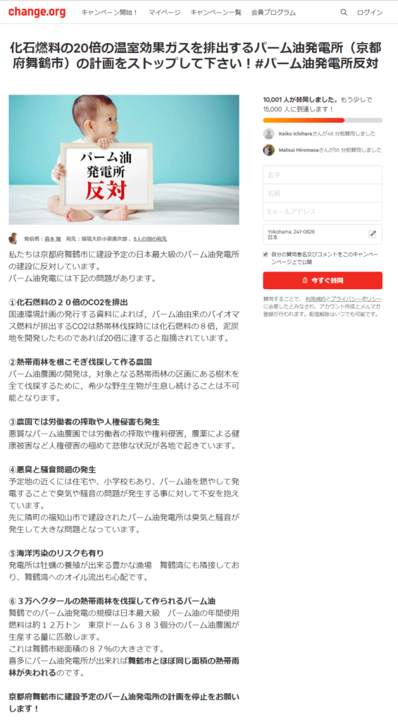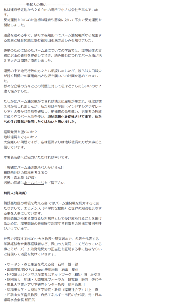 パーム油バイオマス発電所の悪臭・騒音問題に対策を講じることを求める請願書