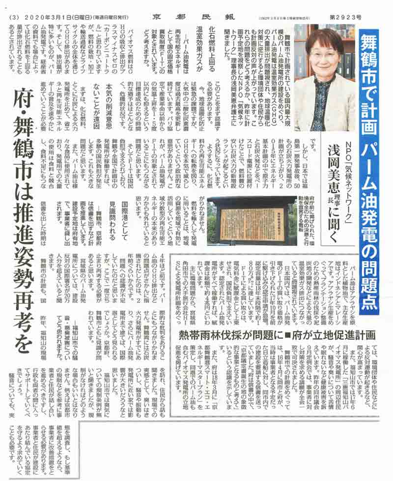 京都民報が舞鶴パーム油火力発電の問題点を掲載(気候ネットワーク浅岡理事の説明)2020年3月1日