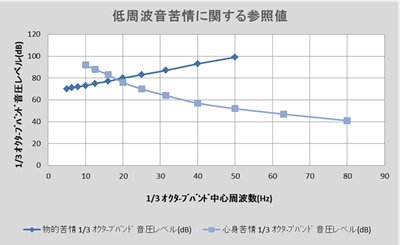 低周波音に関しては普通騒音の受忍限度のように明確な基準値はありません。しかし、低周波音の一つの基準値として環境省から「参照値」が示されている。参照値は大きく分けて物的苦情に関する参照値と心身に係る苦情に関する参照値の二種類に分けられています。