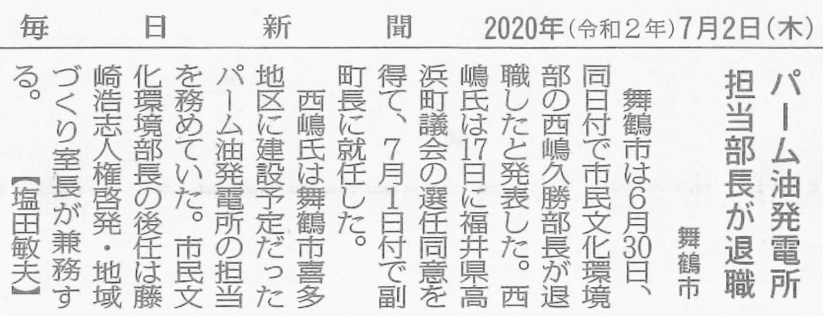 パーム油火力発電の舞鶴市の担当部長 西嶋氏が退職して高浜町の副町長に就任される報道がありました。