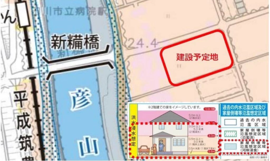 また、本建設予定地は、彦山川側にあり、田川市ハザードマップにおいて洪水浸水想定箇所として明記されており、豪雨時の二次災害も懸念されます。